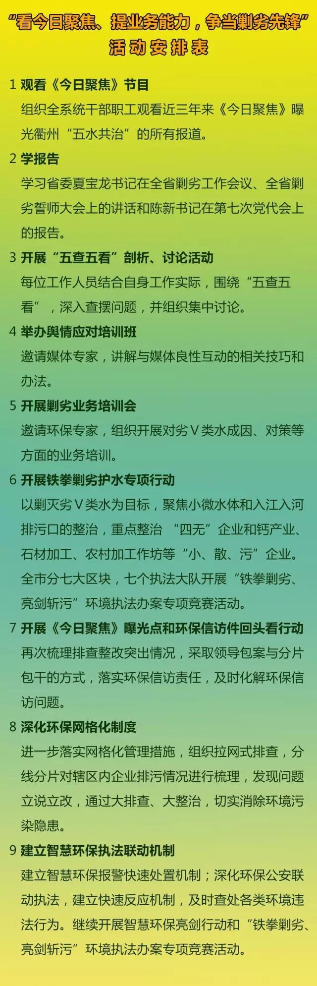 | 為認真貫徹落實全省剿滅劣五類水誓師大會和市第七次黨代會精神,近日,市環保局開展“看今日聚焦、提業務能力,爭當剿劣先鋒”活動, 通過活動轉變干部職工工作作風、提升業務能力,為全市域提前實現剿劣任務作貢獻。 組織全局黨員、執法人員觀看近三年來《今日聚焦》曝光衢州市“五水共治”、環境保護方面的所有報道,開展“五查五看”,全面提升環保系統干部職工業務能力,爭當剿劣先鋒。“五查五看”即查信念,看忠誠;查執法,看公正;查紀律,看嚴明;四是查作風,看勤政;查工作,看成效。 從4月初開始,到11月底前結束,活動分三個階段。 組織全局干部職工觀看近三年來《今日聚焦》曝光衢州“五水共治”的所有報道;深入學習省委夏寶龍書記在全省剿劣工作會議、全省剿劣誓師大會上的講話和陳新書記在第七次黨代會上的報告;開展“五查五看”剖析、討論活動。 |